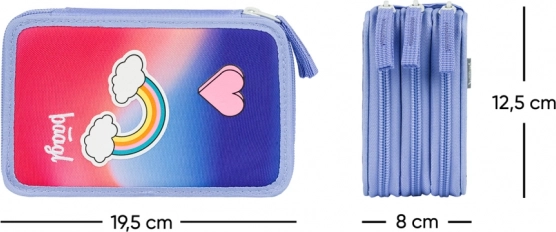 Genießen Sie perfekte Übersicht in drei Etagen – dieses BAAGL-Schul-Federmäppchen fasst alles von Bunt- und Filzstiften bis hin zu Linealen und Radiergummi. Das robuste Textilmaterial mit Regenbogenmotiv und Herz erfreut auf den ersten Blick, während hochwertige Reißverschlüsse und ein verstärkter Rückenbereich ein komfortables Öffnen und langlebige Alltagstauglichkeit gewährleisten.