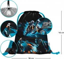 Praktischer Sportbeutel BAAGL mit Motocross-Motiv, ideal für Schuhe und Freizeitaktivitäten. Bietet strapazierfähiges, abwaschbares Material, eine vordere Reißverschlusstasche für Kleinigkeiten und robuste Kordelzüge für bequemes Tragen auf dem Rücken. Dank des Karabiners lässt er sich leicht an Schultasche oder Rucksack befestigen.