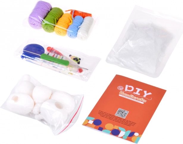 6× Garnknäuel (Ecru, Blau, Gelb, Grün, Lila, Orange); 5× Gummiballon für die Füllung; Füllmaterial (Watte); Häkelnadel 2,5 mm; Sicherheitsschere; 2× Sicherheitsnadel; selbstklebende Augen; 10× Sicherheitsnadel/Marker; Rollmaßband; Heißklebesticks; illustrierte Anleitung (EN)