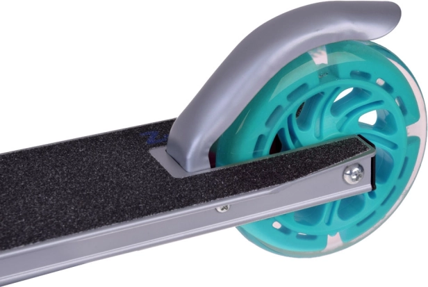 Dieser faltbare Kinderroller kombiniert geringes Gewicht, eine stabile Metallkonstruktion und ein verspieltes Design mit türkisfarbenen Akzenten. Dank der LED-Räder, die während der Fahrt leuchten und keine Batterien benötigen, ist das Kind besser sichtbar und jede Fahrt macht noch mehr Spaß.