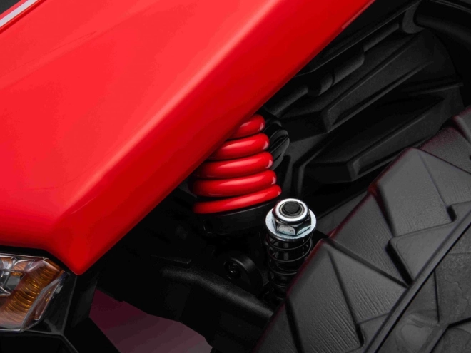 Zwei 24V/200W-Motoren und Geländereifen meistern Unebenheiten und Rasen, während die Federung vorne und hinten für eine komfortable Fahrt sorgt.