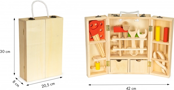 Dieses einzigartige ECOTOYS-Werkzeugsatz ist nicht nur lustig, sondern auch lehrreich. Es besteht aus hochwertigem Holz und enthält: