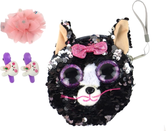 Erleben Sie die Freude Ihrer kleinen Dame mit diesem wunderschönen Set, das mehrere tolle Teile enthält. Das Herzstück ist eine Geldbörse in Kätzchenform mit violetten Augen und rosa Schleife. Perfekt nicht nur zur Aufbewahrung kleiner Schätze, sondern auch für den täglichen Gebrauch.