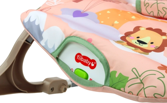 Die Wiege ist mit einem rosa Textilbezug mit Löwenmotiv und bunten Blumendesigns ausgestattet, die die Aufmerksamkeit jedes Babys auf sich ziehen.