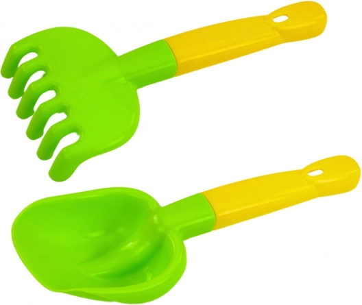 Das Set enthält eine Kinder-Schaufel und eine Harke mit abgerundeten Kanten, ideal für kleine Hände und sicher für Kinder.