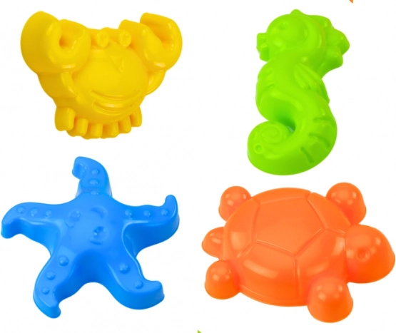 Enthält Förmchen in Form von Krabbe, Seepferdchen, Seestern und Schildkröte für kreatives Gestalten im Sand.