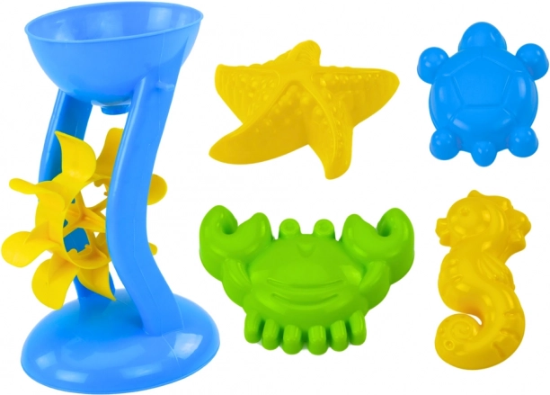 Das Set enthält auch eine Mühle, die zum Durchfließen von Sand oder Wasser verwendet werden kann. Mit der Hilfe von Schaufel und Rechen können kleine Baumeister Burgen und Tunnel erschaffen oder versteckte Schätze suchen. Vier Meeresförmchen in Form eines Seepferdchens, einer Anemone, eines Krabben und einer Schildkröte erhöhen die Kreativität und den Spaß.