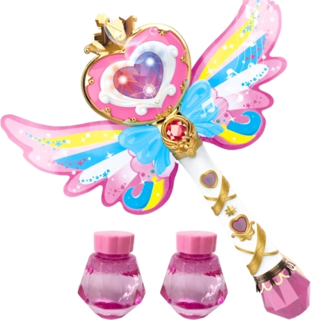 Seifenblasenmaschine in Form eines Stabs. Sein Gehäuse in zarten Pastelltönen von Rosa, Lila und Blau bildet eine harmonische Komposition, die sofort die Aufmerksamkeit auf sich zieht. Goldene Details, darunter aufwendig verzierte Elemente und ein funkelnder roter Kristall, verleihen ihm außergewöhnlichen Glanz und Eleganz.