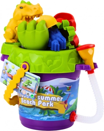 Das komplette Sandspielset mit Dinosauriermotiv beschäftigt Kinder stundenlang. Die integrierte Brause am Eimer und die Mühle mit Trichter verwandeln das Spiel mit Wasser und Sand in kleine Experimente – Kinder können bewässern, den Fluss beobachten und verfolgen, wie Wasser oder Sand durch die Mühle laufen. Der Eimerdeckel fungiert als Sieb zum Trennen von Sand und kleinen Steinen oder Muscheln.