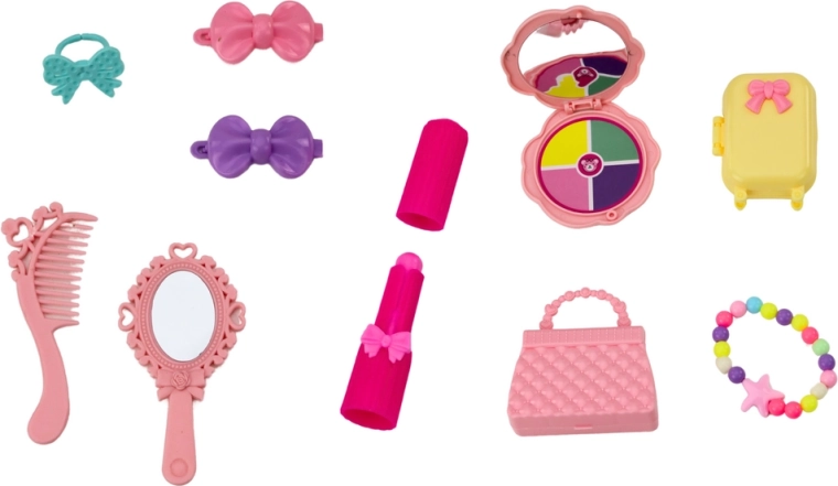 Die Puppe trägt ein elegantes rosa Ballettkleid, das glitzert und die Aufmerksamkeit auf sich zieht. An den Füßen hat sie klassische Ballettschläppchen, die um den Knöchel gebunden sind und ihr das authentische Aussehen einer echten Ballerina verleihen. Die Puppe hat lange blonde Haare, zu einem hohen Dutt frisiert, der ihren Ballettstil unterstreicht. Zartes Make-up und eine bunte Halskette verleihen ihr Charme und Eleganz. Zur Puppe gehören eine stylische Handtasche, ideal für ihre kleinen Accessoires; ein funktionaler Koffer für ihre Ballettreisen; Haarspangen, um die Frisur der Puppe zu stylen; ein kleiner Ring für einen Hauch von Eleganz; sowie ein Spiegel, eine Bürste und ein Handspiegel, damit die Puppe vor dem Auftritt ihr Aussehen überprüfen kann.