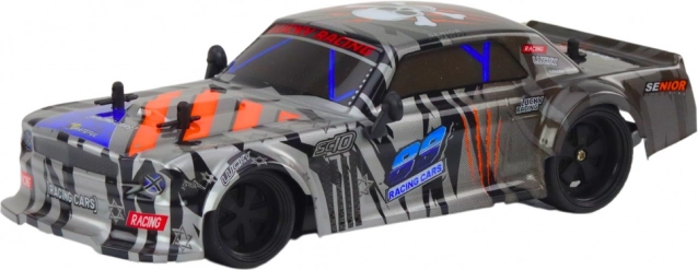 Graue Karosserie mit orangefarbenen Akzenten und Rennaufklebern verleiht dem Auto einen authentischen Look. Niedriges Profil und breite Räder unterstützen die Stabilität bei höheren Geschwindigkeiten.