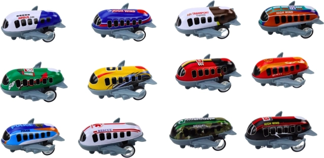 Genießen Sie Stunden der Kreativität und des Spaßes mit diesem Satz von 12 Flugzeugspielzeugen. Jedes Modell ist mit einem Antrieb und Rädern für Rollenspiele ausgestattet. Bunte Flugzeuge mit Beschriftungen wie „High Wind“ und „Air Transport“ inspirieren die Fantasie der Kinder.