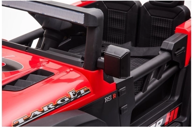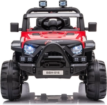 Das rote batteriebetriebene Auto mit sportlich-geländegängigem Design ist ideal für abenteuerliche Fahrten. Die robuste Konstruktion, der markante vordere Stoßfänger und realistische Details vermitteln ein authentisches Fahrerlebnis. Große Räder mit tiefem Profil meistern Unebenheiten, und die Frontscheinwerfer verleihen dem Spiel zusätzliche Realitätsnähe.
