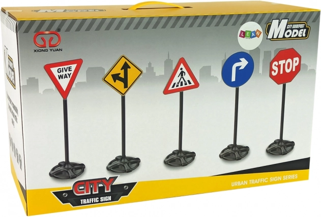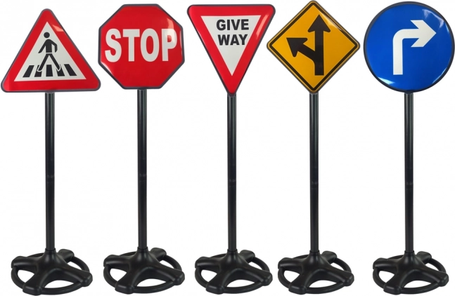 • Lieferumfang (5 Schilder): Vorgeschriebene Fahrtrichtung rechts, Vorfahrt gewähren, Fußgängerüberweg, Stop, Gabelung (Straßenverzweigung)