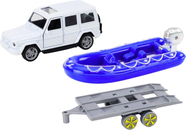 Erleben Sie aufregende Abenteuer mit dem Geländewagen und dem blauen Motorboot! Dieses Metallmodell bietet präzise Details, einschließlich öffnbarer Türen, in die Kinder Fahrer- und Passagierfiguren setzen können.