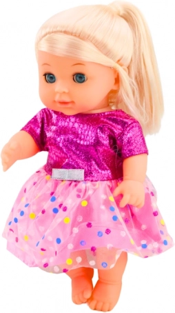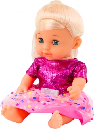 Diese bezaubernde Puppe mit blondem Haar und blauen Augen ist ideal, um die Babypflege nachzuahmen. Dank beweglicher Arme, Beine und Kopf kann sie leicht gesetzt oder gelegt werden, und die realistische Pipi-Funktion nach dem Trinken aus dem Fläschchen verleiht dem Spiel Authentizität.