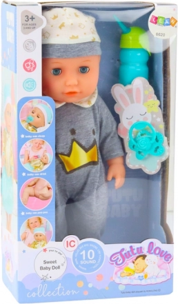 Am Bauch der Puppe befindet sich ein Lautsprecher, der nach dem Drücken eines Knopfes verschiedene Babygeräusche abspielt. Diese Funktion entwickelt die kindliche Vorstellungskraft und Hörfähigkeiten.
