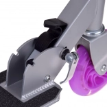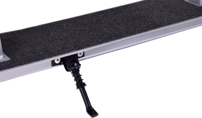Die Lenkerhöhe lässt sich bequem in drei Stufen einstellen, die Schaumstoffgriffe liegen angenehm in der Hand und die rutschfeste Trittfläche hält den Fuß auch bei längeren Fahrten sicher. Die Fußbremse am Hinterrad ermöglicht ein schnelles und sanftes Anhalten, und der klappbare Ständer erleichtert das Abstellen überall.