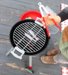 Das Set enthält alles, was man für ein Familien-BBQ braucht: Schlitze im Grillrost, eine große Auswahl an Plastiklebensmitteln (Würstchen, Steaks, Hähnchen, Fische, Mais, Aubergine), Zubehör, Teller, Becher und sogar eine Pfeffermühle. Der abnehmbare Deckel schützt den Rost nach dem „Grillen“ und dank der Räder und des Griffs lässt sich der Grill leicht auf die Terrasse oder ins Kinderzimmer bewegen.