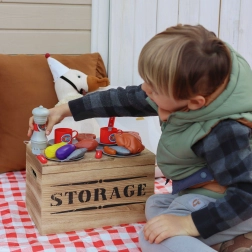 Der abnehmbare Deckel schützt den Rost, während Räder und Griff das Verschieben im Haus und Garten erleichtern. Die robuste Konstruktion hält dem täglichen Spielen stand.