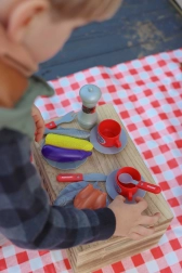 Würstchen, Steaks, Hähnchen, Fische, Mais, Aubergine, Teller, Besteck, Becher, Pfeffermühle, Zange und ein Feuerzeug – alles in einem Set für stundenlangen Spielspaß.