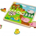 Das Holz-Soundpuzzle mit Bauernhofmotiv ermöglicht Kindern erste Entdeckungen von Formen, Farben und Klängen. Jedes Teil stellt ein bekanntes Nutztier dar und beim Einsetzen an die richtige Stelle ertönt ein charakteristischer Laut, der natürliche Neugier und Konzentration fördert.