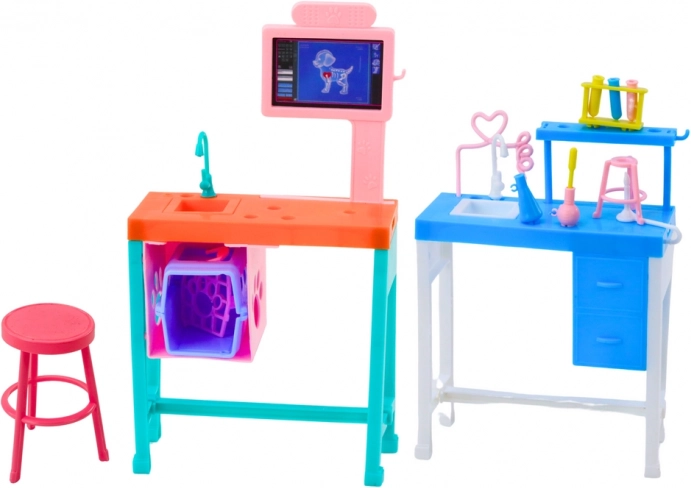 Die Klinik umfasst ein Waschbecken, einen Hocker und einen Computer für realistische Spiele zur Untersuchung und Behandlung von Tieren.
