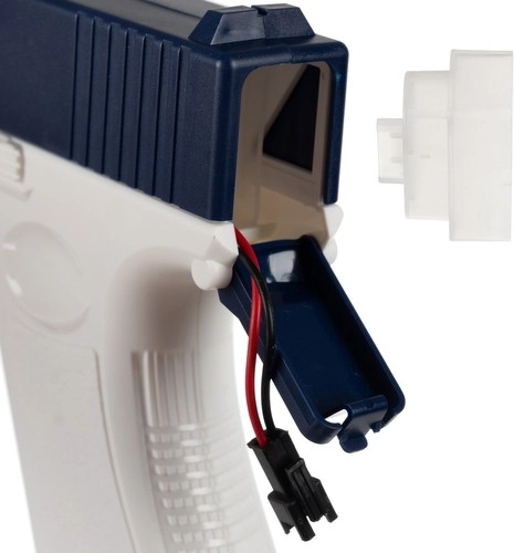 Einfach den Abzug halten, und die Pistole feuert kontinuierlich, ganz ohne manuelles Pumpen. Der im Lieferumfang enthaltene wiederaufladbare Akku ermöglicht bis zu 50 Minuten Spielzeit und lässt sich bequem per USB laden.