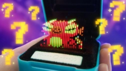 Blaue Box mit Pixel-/animierter Darstellung der Figuren