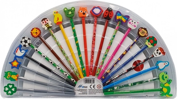 Das Set erfreut jeden jungen Illustrator. Die Buntstifte sind mit bunten Mustern verziert und mit Radiergummis in verschiedenen Formen versehen.