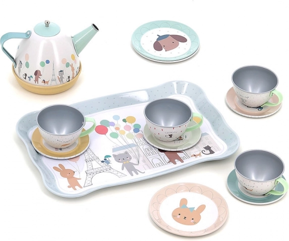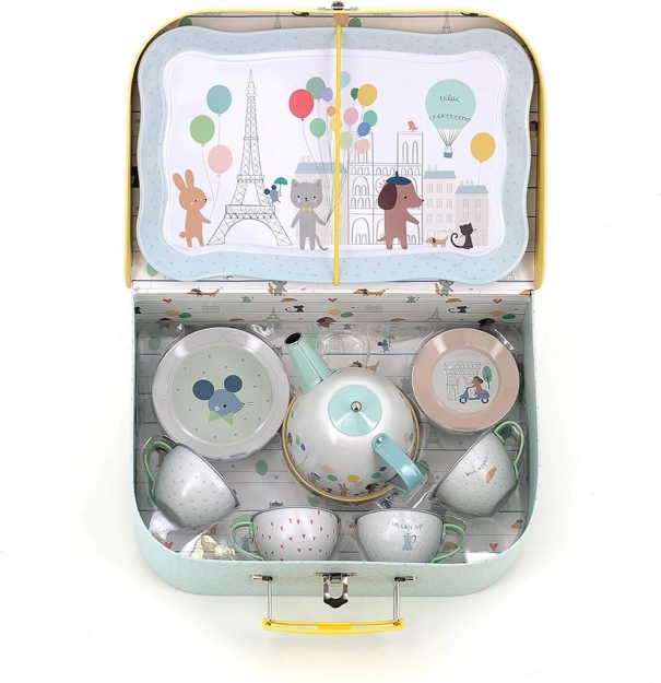 Dieses niedliche Set enthält 14 Teile, die von Sarah Betz illustriert sind und mit sanften Farben und Motiven ein Gefühl von Paris vermitteln. Das Set umfasst ein Tablett, eine Kanne und vier Tassen mit Untertassen, ideal für spielerische Teepartys. Dank des praktischen Koffers können Sie das Set einfach transportieren und auch unterwegs nutzen.