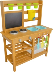 - **Inklusive Zubehör:** Diese Küche enthält nützliche Elemente wie Wasserhahn, Kocher, Küchenutensilien in Form einer kleinen Schaufel und eines Rechens sowie Eimer.