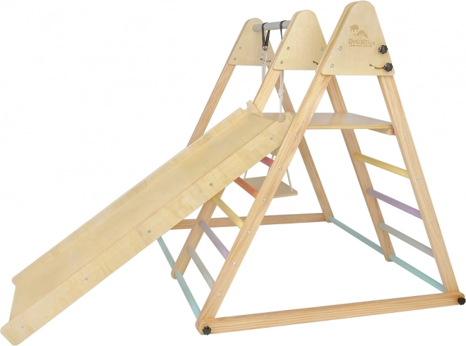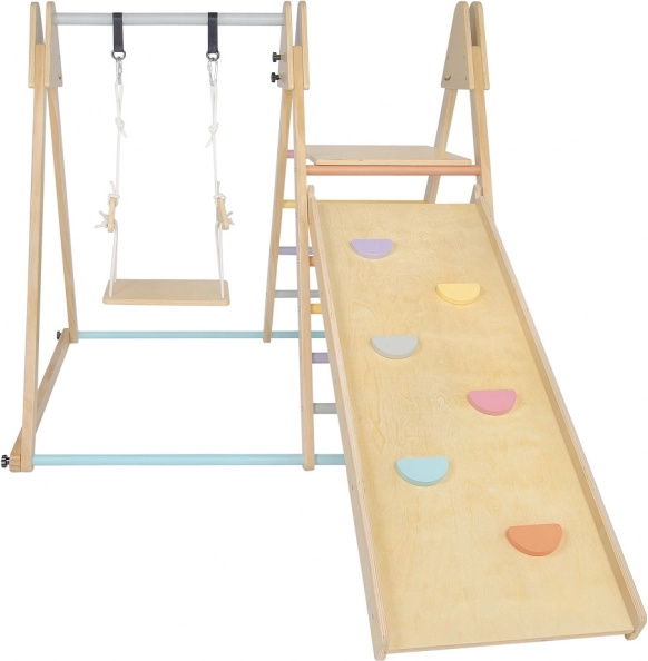 Die Montage ist erforderlich und eine detaillierte Anleitung in den Sprachen CZ, SK und EN liegt bei. Das Set ist mit einer Schaukel, einer Kletterwand und einer Rutsche mit pastellfarbenen Griffen für maximalen Spielspaß ausgestattet.
