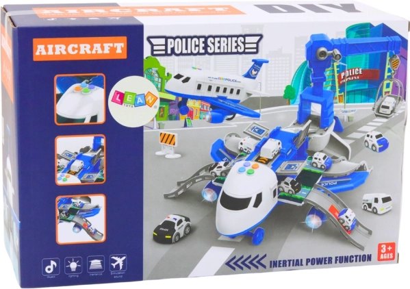 Ausgeklappt verwandelt sich das Flugzeug in eine mobile Polizeistation, aus der drei Metall-Einsatzfahrzeuge ausrücken. Auf dem Dach befindet sich eine spezielle Plattform, die beim Drücken der Taste das Polizeiauto für einen schnellen Einsatz „abschießt“. Im Set enthalten sind Verkehrsschilder, Kegel und Bäume zum Aufbau eigener Szenarien. Ein drehbarer Kran mit 360°-Rotation und eine per Drehrad bedienbare Hebebühne bieten zusätzliche Spielmöglichkeiten.