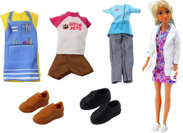 Puppe, mehrere Outfits (Kittel, Schürze, Freizeitkleidung), Schuhe, thematisches Zubehör (z. B. Stethoskop, Küchenutensilien, Tier-Accessoires)