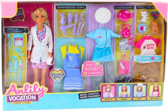 Puppe Anlily 4-in-1 – Ärztin, Friseurin, Köchin und Tierpflegerin mit Outfits und Zubehör