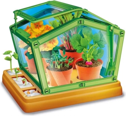 Dieses Lernset bringt Kindern die Grundlagen der Botanik einfach und spielerisch näher. Das transparente Gewächshaus mit verstellbarem Dach hilft, Feuchtigkeit und Temperatur zu regulieren – perfekt für erste Anbau-Experimente zu Hause.