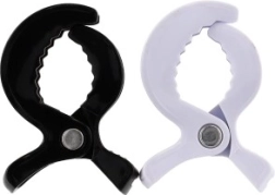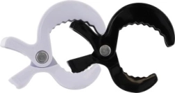 Praktische Kunststoff-Clips für den Kinderwagen in schwarz‑weißer Farbe zur einfachen und sicheren Befestigung von Zubehör. Ideal für Windeln, Handtücher, Insektenschutznetze und andere Textilien. Die Packung enthält 2 Stück mit festem Griff und robustem Metallscharnier für den täglichen Gebrauch.