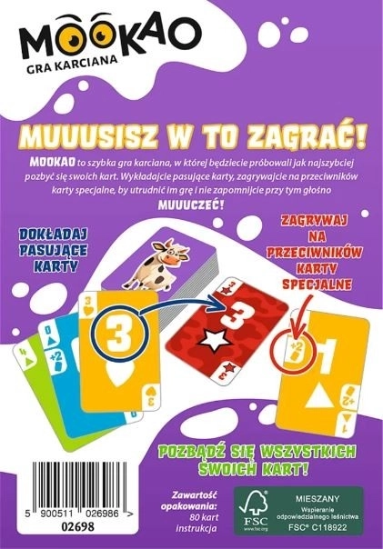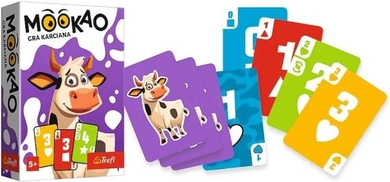 Ein unterhaltsames und dynamisches Kartenspiel MooKao von Trefl, bei dem es das Ziel ist, so schnell wie möglich alle Karten aus der Hand loszuwerden. Spiele passende Karten, nutze Spezialeffekte gegen deine Gegner und vergiss nicht dabei kräftig zu muuuuhen – Lachen und Spannung garantiert!