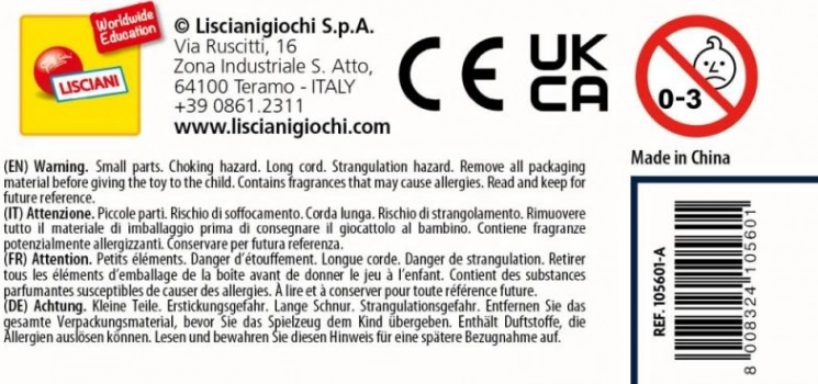 Das Produkt entspricht den europäischen Normen (CE). Hinweis: Nicht geeignet für Kinder unter 3 Jahren – Kleinteile und Schnur.