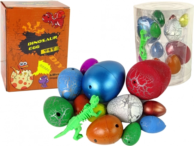 In der Packung finden Sie 12 Stück Eier in verschiedenen Farben, Mustern und Größen (von ca. 3 × 2 cm bis 6 × 4,5 cm) sowie zusätzlich ein grünes Dinosaurier-„Skelett“ mit 6 cm Länge. Alles ist in einer praktischen Plastikröhre und Geschenkverpackung untergebracht.