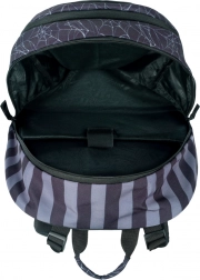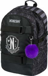 Entdecken Sie Komfort und Funktionalität in einem. Dieser Rucksack in dunklem, stylischem Design mit Wednesday-Motiv bietet eine durchdachte Aufteilung: drei separat verschließbare Fächer mit Innenorganizer, eine geräumige Tasche für ein 15"-Notebook oder Tablet und robuste Seitentaschen, die sich für Trinkflaschen eignen. Das geringe Gewicht von 850 g und das Volumen von 25 l stellen sicher, dass er den Schulalltag mühelos meistert.