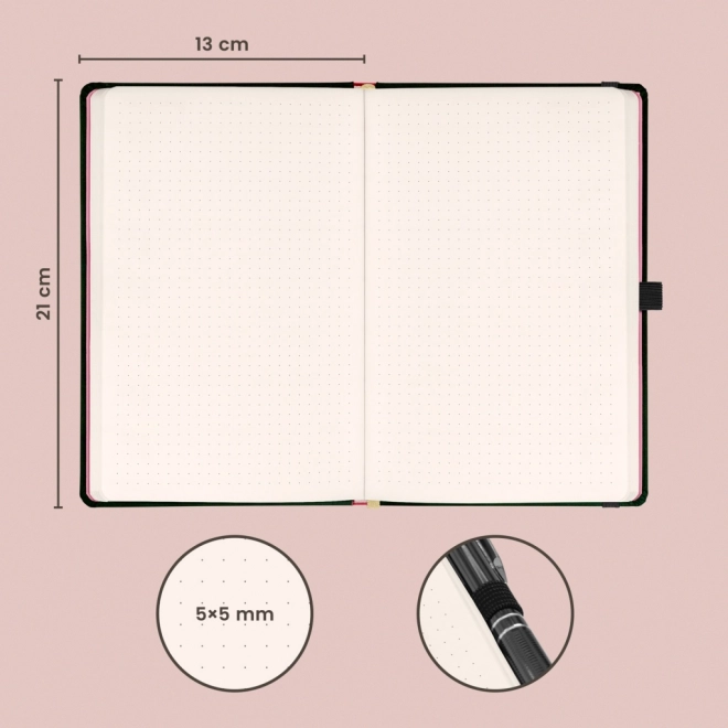 Die gepunkteten Seiten bieten Freiheit für präzise Planung, Zeichnen und übersichtliche Notizen. Der Gummibandverschluss hält alles zusammen, die hintere Tasche verstaut Kleinigkeiten und die Schlaufe sorgt dafür, dass der Stift immer griffbereit ist.