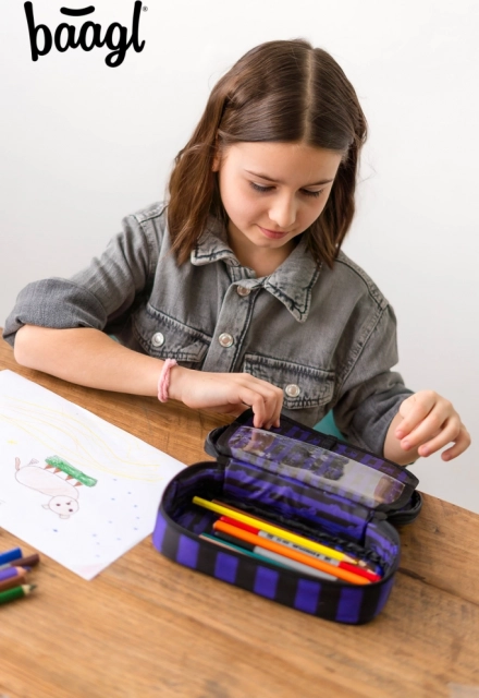 Suchen Sie ein langlebiges und bersichtliches Etui für die Schule? Dieses BAAGL-Etui mit dem ikonischen Wednesday-Motiv kombiniert modernes Design mit praktischen Details für den täglichen Gebrauch. Dank der stabilen Ausführung behält es hervorragend die Form und schützt Schreibutensilien.