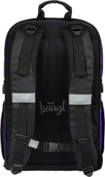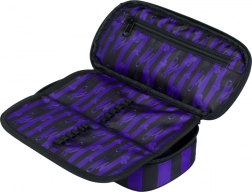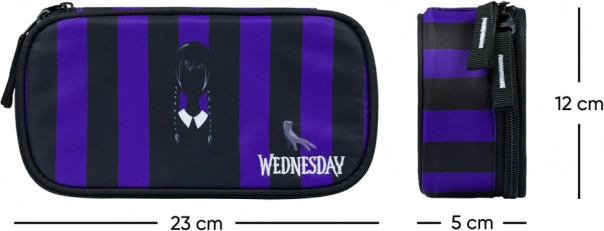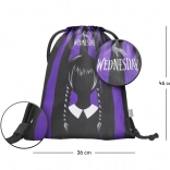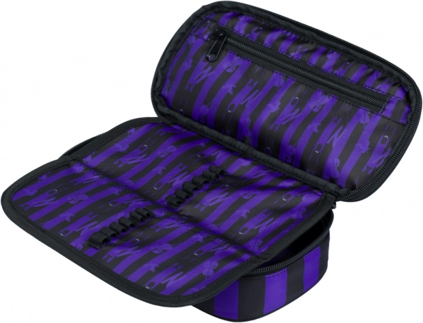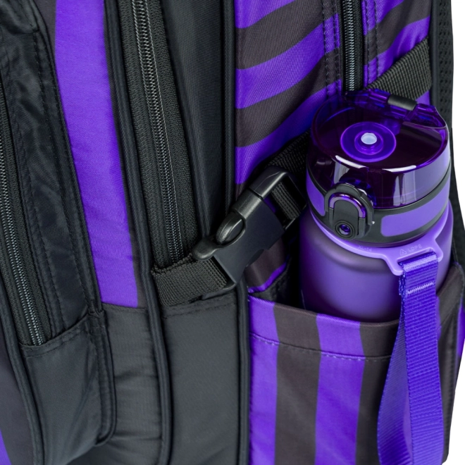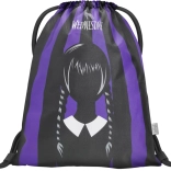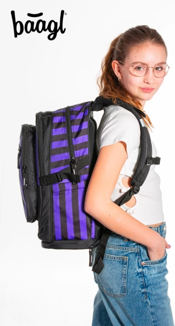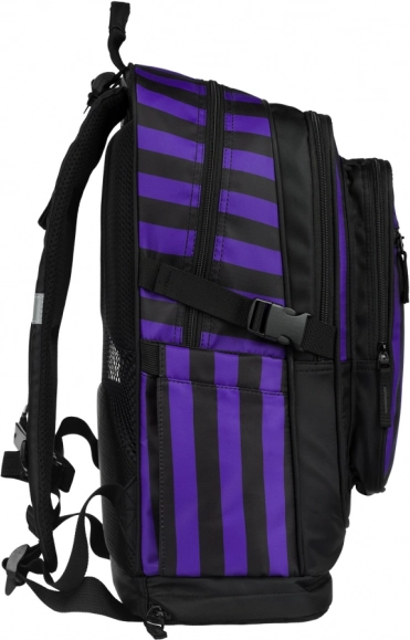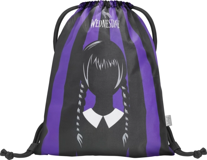 Das Cubic-Wednesday-Set enthält einen stilvollen Rucksack, ein praktisches Federmäppchen und einen Schuhbeutel – alles im modernen Design mit schwarzen und violetten Streifen. Der Rucksack ist ergonomisch gestaltet, während Mäppchen und Beutel für Ordnung bei Schulbedarf und Freizeitaktivitäten sorgen.