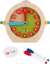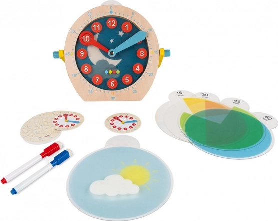 Im Lieferumfang enthalten ist ein Set aus 14 abwischbaren Karten und 2 farbigen Stiften, mit denen Kinder unterschiedliche Zeitsituationen immer wieder notieren und üben können – vom morgendlichen Aufstehen bis zum abendlichen Zubettgehen. Die robuste Ausführung aus Holz sorgt für Langlebigkeit und sicheres Spielen.