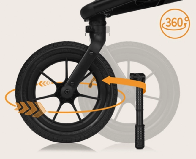 Große luftgefüllte Räder mit schwenkbarem Vorderrad (360°) und Arretierung sorgen für Sicherheit auf Gehwegen und im Gelände. Die Federung vorne und hinten gewährleistet eine ruhige, gleichmäßige Fahrt.