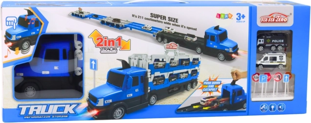 Dieser multifunktionale Lkw in attraktivem Blau kombiniert Autotransporter und 2-in-1-Rennstrecke. Ausgeklappt erhalten Sie eine bis zu 211 cm lange Strecke – ideal für dynamische Duelle und das Trainieren von Fahrkünsten. Realistische Lichter und Geräusche verstärken die Atmosphäre wie bei echten Rennen.