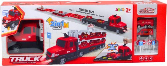 Dieser multifunktionale Autotransporter bietet doppelten Spielspaß. Im Lkw-Modus transportiert er Autos, und aufgeklappt entsteht eine lange Rennstrecke für spannende Fahrten. Licht und Sound verstärken die Atmosphäre von Rennen und Rettungsmissionen.