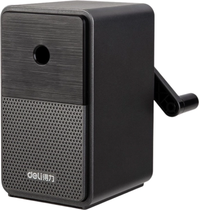 Eleganter manueller Kurbelspitzer in Schwarz mit stufenloser Spitzenregulierung, großem Auffangbehälter und komfortabler Handhabung für Zuhause, Schule und Büro. Die stabile Konstruktion und die präzise Einstellung der Spitzenlänge sorgen stets für perfekt gespitzte Blei- oder Buntstifte.